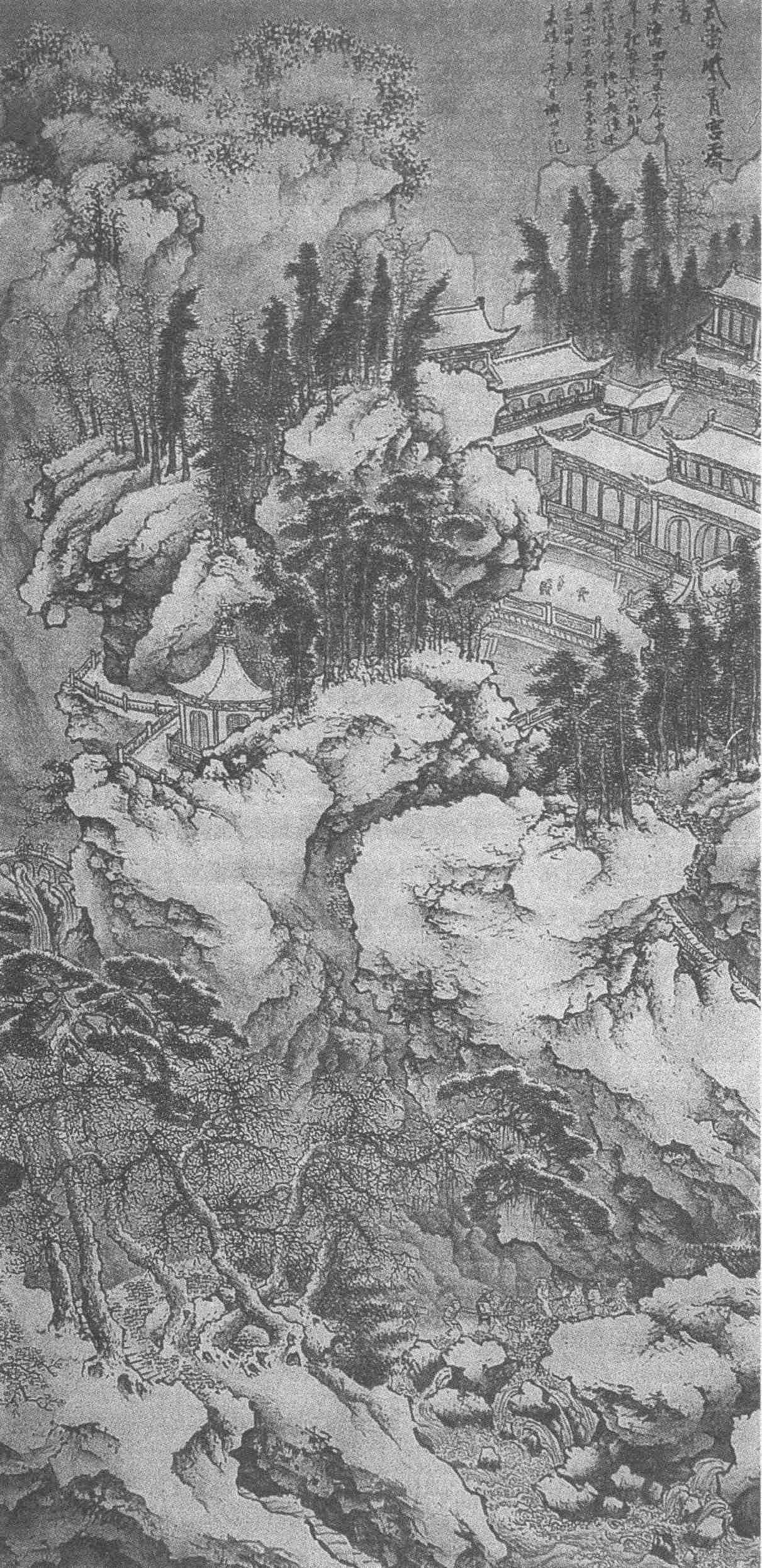 画幅的右上角,在迥出云表的秀峰下,作者用茂密的松柏,环抱着一批下临无地的殿阁楼台,这就是题款所点的“紫霄宫”庄严圣地。
