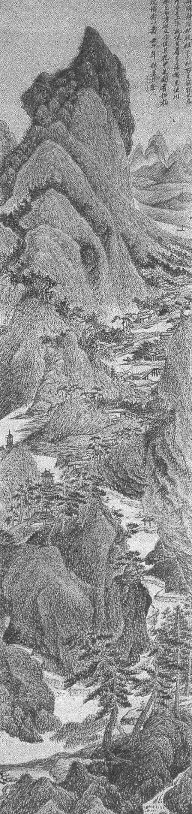 《静深秋晓图》是狭长条幅的水墨山水,全图重峦叠嶂,山势连绵,乔松迤逦于岩壑间。近景有高人傍水闲坐;中景一塔耸然,遥接上端高山;远处大江斜出,水流从画外再度回入,在山山村村间蜿蜒盘曲,大江彼岸,远岫不尽,极咫尺千里之遥。在如此狭长空间,作深远无垠、曲折有致的山水开合,真是经营位置,备见苦心。
