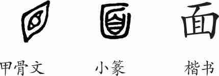 “面”是象形字。甲骨文像人脸之形,中间是一只大眼晴(目)。小篆发生了讹变。隶变后楷书写作“面”。