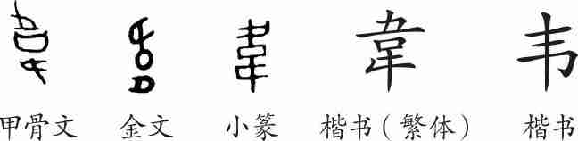 “韦”是会意字。甲骨文从囗(城),从两足,也有三足的。金文大体相同,小篆整齐化。隶变后楷书写作“韋”。汉字简化后写作“韦”。