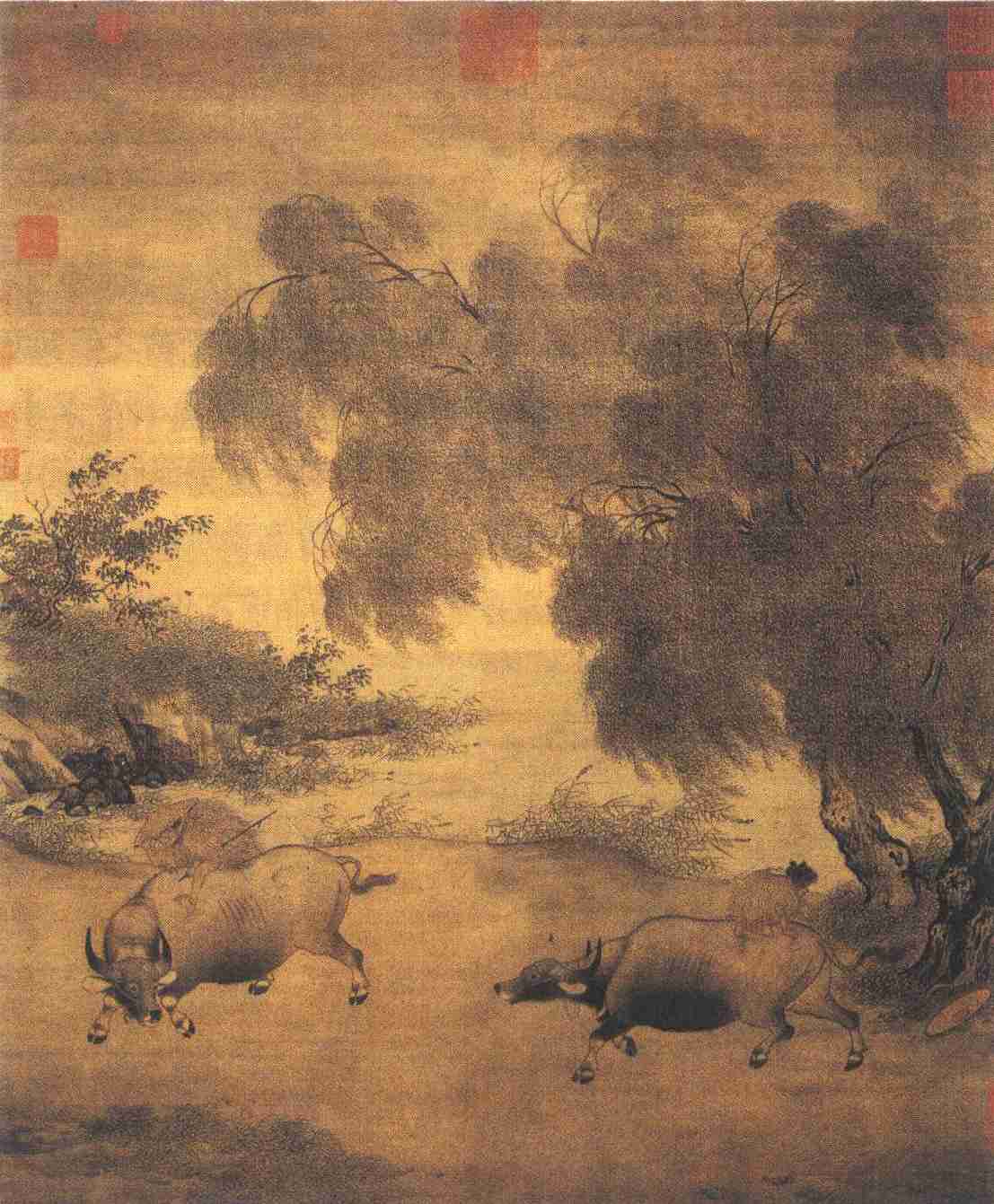 “风雨”的特定气氛是笼罩作品的“灵魂”。牧童的“归”恐怕也是由于风雨所致。要不,风不吹,雨不下,也许他俩还在溪里泼水嬉戏,或者坐在牛背上吹芦笛呢!即使是“归”,若无风雨,也可以悠哉乐哉哼着小曲子,充满牧歌情调。绝不会像本图那样充满着戏剧性。