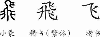 “飞”是象形字。小篆字形下面像展开的双翼,上面像鸟头。隶变后楷书写作“飛”。汉字简化后写作“飞”。