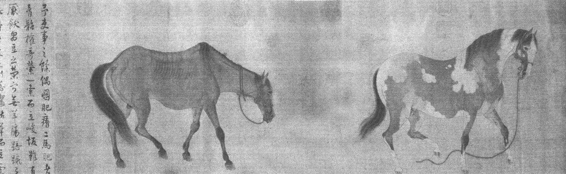 由于肥瘦两马的机遇不同,处境有别,为了求异而不存同,所以作者没有给予特定的景物和情节之联系。只是在画面上平排并列,各占一方,以突出神态之对比,显得格外醒目。