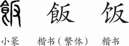 “饭”是形声字。小篆从食,反声。隶变后楷书写作“飯”。汉字简化后写作“饭”。