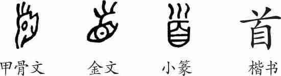 “首”是象形字。甲骨文看起来像兽头的侧面。金文用眉头和眼睛表示整个人头。小篆的形体承接金文并整齐化。隶变后楷书写作“首”。