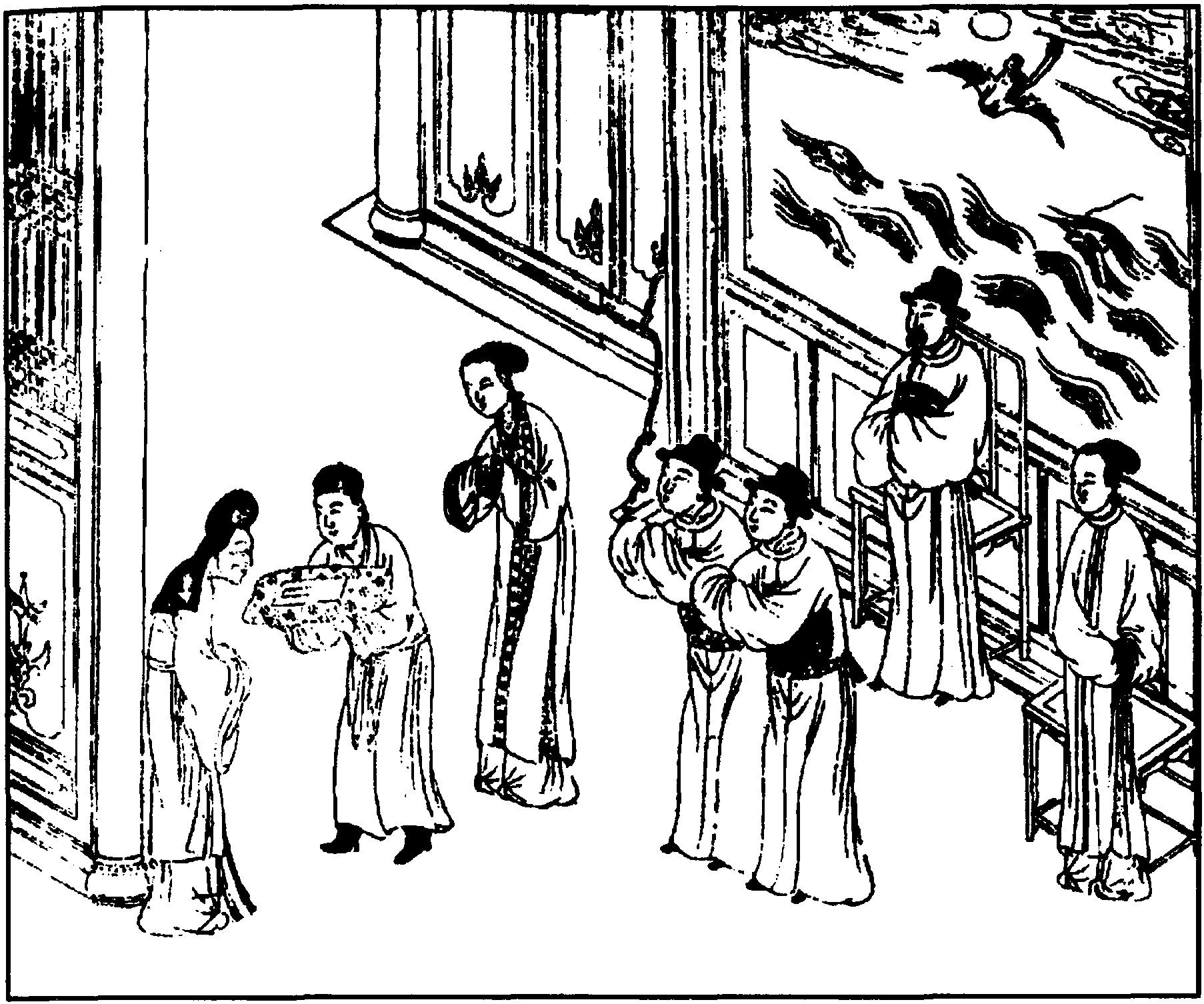 这里所选,为九成、九思赴京应试后,张母和九成妻在家思念之曲。第一首 【薄倖】先由张母 (贴扮) 唱。淑气,春日温和之气; 东风,春风。李白 《春日独酌》诗: “东风扇淑气,水木荣春晖。” 春日而有 “落红零乱”,可见已届暮春。张母由暮春想到自己亦已年老。接着,九成妻 (旦扮) 诉说丈夫远行,冷落了鱼水之乐。凤管,即笙。楚调,据《乐府诗集·相和歌辞》 云: “楚调者,汉房中乐也。高帝乐楚声,故房中乐皆楚声也。” “几度见秦楼月满”,用李白乐府诗《忆秦娥》 “箫声咽,秦娥梦断秦楼月” 之意,表达了几番梦中相会、醒来满怀惆怅之情。其后二、四两首为张母之词,她为孩儿远游、杳无音信而愁肠寸断,盼望着他们能平步青云、锦衣归来。这里“奈衡湘信杳无鱼雁”,乃压缩《琵琶记·官邸忧思》 “湘浦鱼沉,衡阳雁断,音书要寄无方便” 之句而得,说明音书不通。第三、五首为九成妻所唱,她因“钗分凤鸾”,自己形单影只而懒于临妆、愁损旧颜,又为高堂“日近桑榆”、时日无多而盼望丈夫早日还家。五支曲子皆忆子、思夫之词,感情真实,情与景亦相交融。