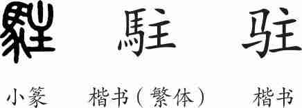 “驻”是形声字。小篆从馬,主声。隶变后楷书写作“駐”,汉字简化后写为“驻”。