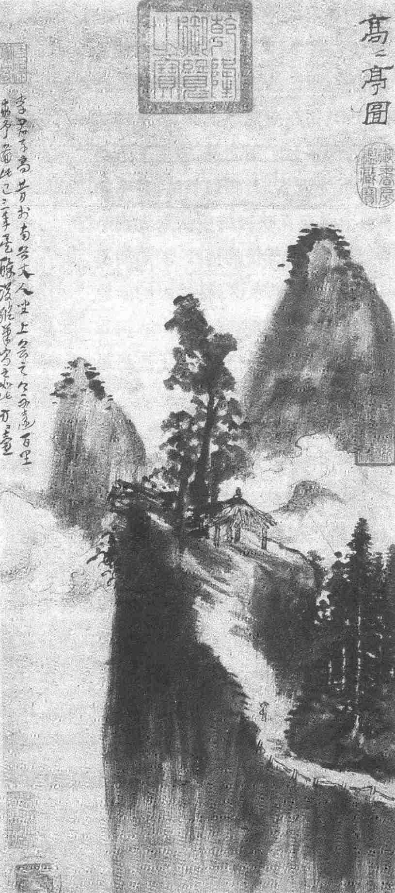 观此图,我们决不会“生此意,如真在此山中”,却不难想象到画家创构时的情景:当其杯酒狼藉,伏案假寐,恍惚间进入了虚幻的、下意识的梦境,一种油然的冲动促使他不自觉地起身、拂纸、濡墨、挥毫,开始时比较生硬,但不久便充分自由地在纸上挥洒起来,用笔草草,水墨淋漓,画出了奇气横溢、生趣盎然的《高高亭图》。诚如山水画大师黄公望所云:“此图此景入天机,谁能仿佛方壶老!”