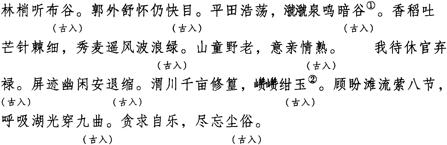 注:一、本词例押古入声“屋” “沃”韵。因“屋” “沃”在古韵中与“术”“束”同韵,而“木”“束”在现代韵中属“姑”韵,故全调可押姑部“姑” 韵。