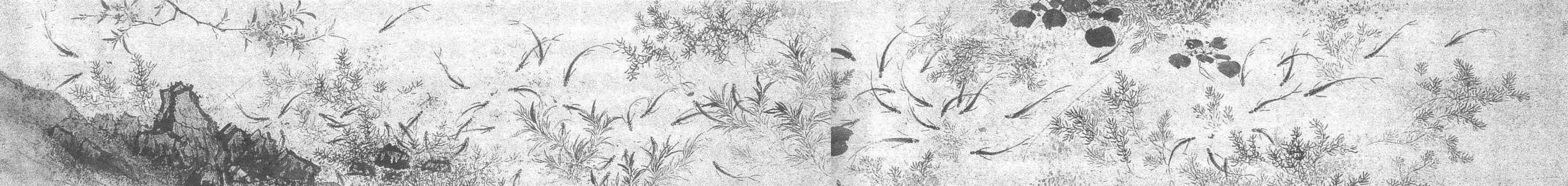 此卷写群鱼戏水,水藻丰茂,鱼群得乐,回旋追逐,形态自然而生动。卷末作重墨乱石斜坡,上有倒垂花枝,以静济动,以重镇轻。