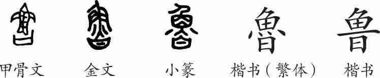 “鲁”是会意字。甲骨文从口,从鱼,会器中盛有烹调好的味道佳美的鱼之意。金文在口中加一点成甘,强调味道可口。隶变后楷书写作“魯”。汉字简化后写作“鲁”。