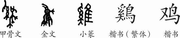 “鸡”是象形字。甲骨文、金文都像一只公鸡的形象。小篆变成了从隹(鸟)、奚声的形声字。隶变后楷书写作“雞”。汉字简化后写作“鸡”。
