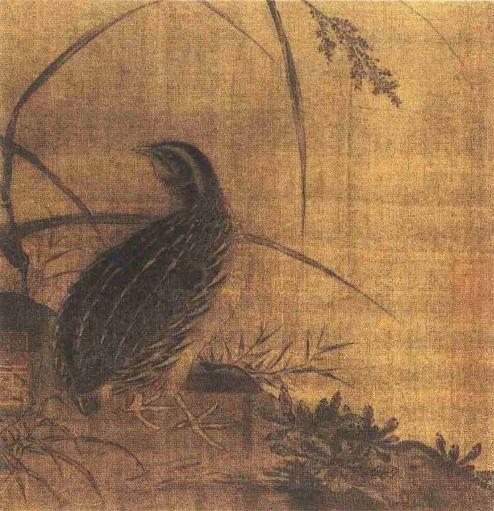 《鹌鹑图》仅画一鹌鹑,行至溪畔,转首回眸,似寻觅,似呼唤,姿态闲适。图中无多背景,唯临溪坡岸一角,以水墨勾写,复晕擦数笔,岸边着野草芦荻,着意写一枝,沿左边舒展,芦叶萧疏,三五片叶,上着荻花而未放,点明为秋熟时节。