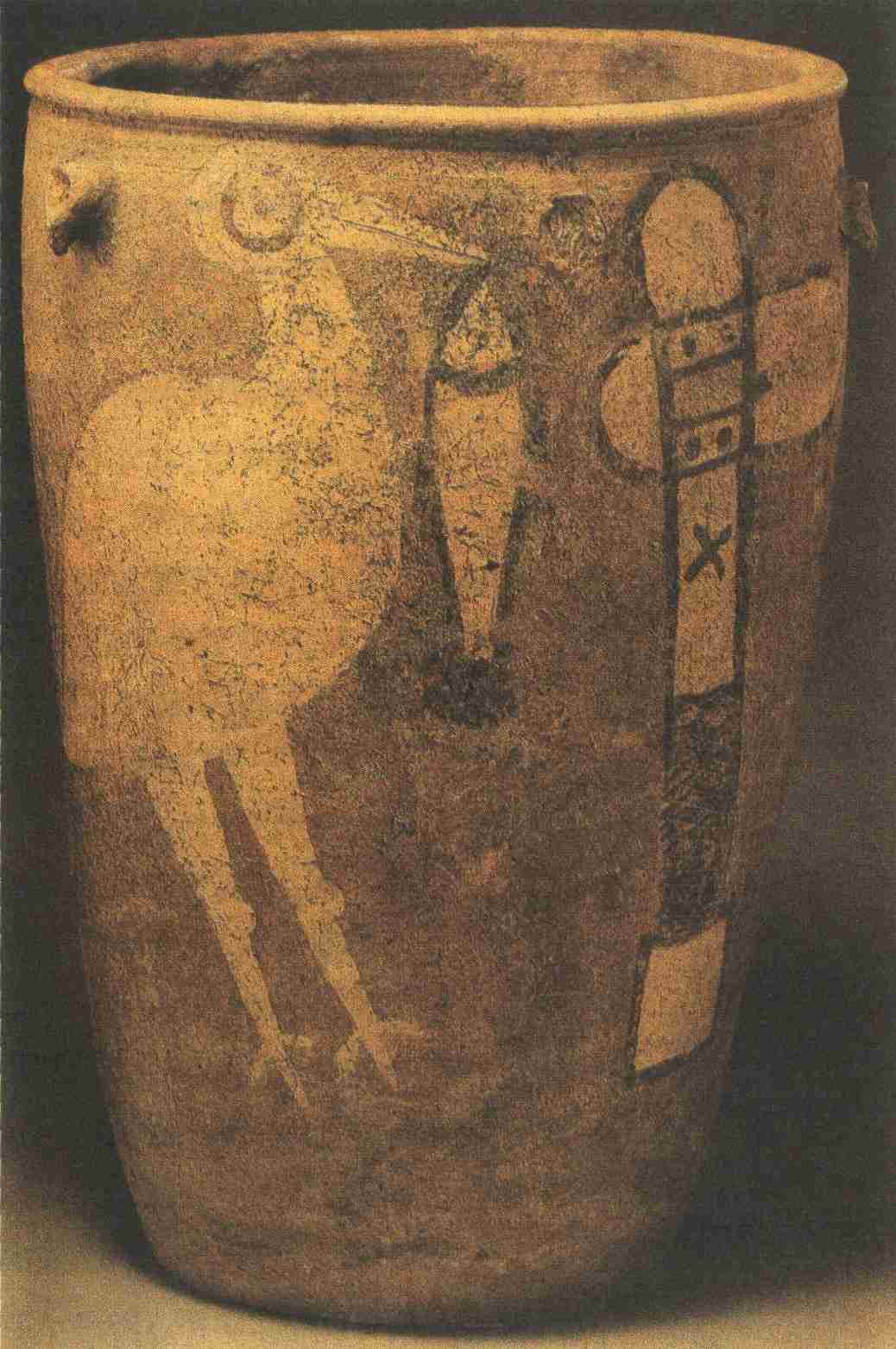 1978年发现的鹳鱼石斧纹彩陶缸,其器形为敞口、圆唇、深腹,高47厘米,口径32.7厘米,底径19.5厘米,沿下有四个对称的鼻钮,腹部有彩绘《鹳鱼石斧图》,是一件富有寓意的近似图腾的艺术品。