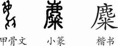 “麋”是形声字。甲骨文像头朝左、尾朝右的一只麋鹿的形象。小篆从鹿,米声。隶变后楷书写作“麋”。