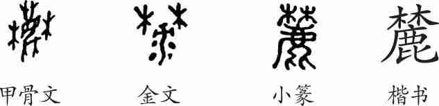 “麓”是会意兼形声字。甲骨文是两个“木”字当中有一只鹿在跑。金文的字形已经看不出是鹿了。小篆将甲骨文的“林”字移到“鹿”的头上。隶变后楷书写作“麓”。