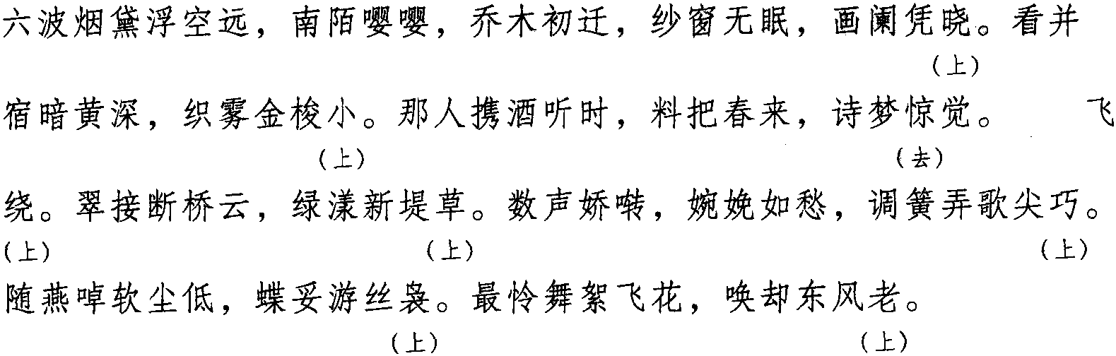 | 释义 | 《黄莺儿》词牌|格律|词趣|词谱|词例《黄莺儿》词牌|格律|词趣|词谱|词例 【词律·词趣】 本格双片九十六字。全词同韵,仄韵,韵字可上声、可去声。因柳永咏黄莺词 “园林晴昼春谁主” 而得名。 上片 下片 【词人·词例】 南宋 陈允平 (约1205—约1280),字君衡,一字衡仲,号西麓,四明 (今浙江宁波) 人。著名词人。恭帝时授沿海制置司参议官。词学周邦彦。有 《西麓继周集》《西麓诗稿》《日湖渔唱》。词存二百零九首。