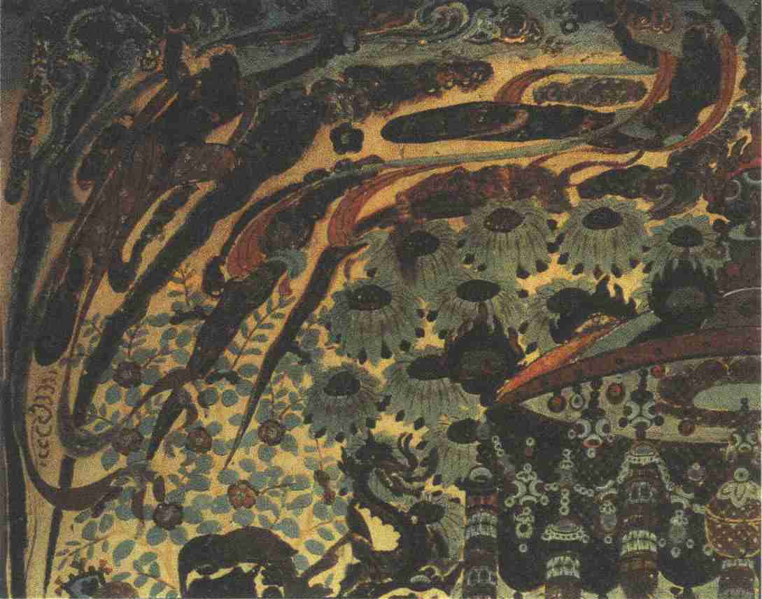 一个酱黑色的右倾“Y”字形,是飞天矫健的身躯和舒展的双臂,腰下长裙循势展拂,两肩飘带顺向作流线形,并在末梢翻起成“S”形,如流如注,一气呵成。“Y”字形两侧各有一道五彩祥云飘然升空,渐上渐大,组成一个宽松而又内敛的大“Y”字形。顶框处并列右行的四、五朵小云,使大小“Y”字形的开口处折势而右,在飞天右向的颜面、手掌和飘带右向翻折的末梢照应下,构成一个下锐角、上钝角而弦内弧的倒三角形,恰到好处地安置于菩提树的圆形轮廓和边框的矩形角之间,随遇成形,不枝不蔓。而描绘所有这一切所使用的一色弧线,或蜿蜒回环,或并行不悖,或交叉相向,极尽变化对比和充实照应之能事,使飞天、衣带和云气、天花,都用同一个速律流转运行。这是从“形”的角度所作的观照。