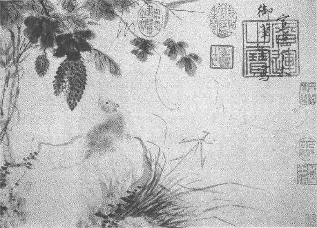 明代宣宗朱瞻基画《鼠石图》,自题款识:“宣德丁未御笔戏写。”丁未是宣德二年(1427),款字上钤明代内府大印“广运之宝”一方。其他还钤有清乾隆、嘉庆、宣统鉴藏印玺和“石渠宝笈”、“石渠定鉴”、“宝笈重编”等内府著录印记。又有清代收藏家宋荦鉴藏印一方。