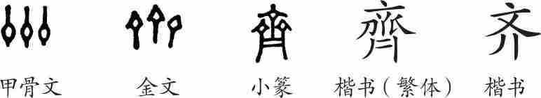 《说文·齊部》:“齊,禾麦所吐的穗上端平也。象形。凡齊之属皆从齊。”(齊,禾麦吐穗,其上平整。象形。大凡齊的部属都从齊。)
