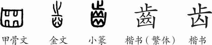 “齿”本为象形字,甲骨文像人的口,上下各露出了两颗牙齿。金文加上了声符“止”,成了形声字。小篆承接金文并整齐化。隶变后楷书写作“齒”。汉字简化后写作“齿”。