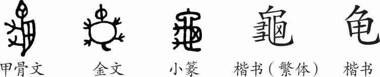 《说文·龜部》:“龜,旧也。外骨内肉者也。从它,龜头与它头同。象足甲尾之形。凡龜之属皆从龜。”(龜,年岁长久。外面是骨头、里面是肉的动物。从它,“龜”字的头与“它”(蛇)字的头相同。像脚、背甲、尾巴的形状。大凡龟的部属都从龟。)