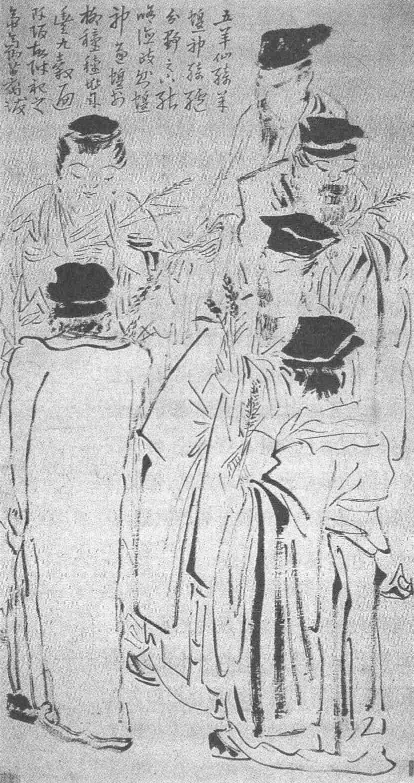 画家对这个充满神奇的故事有着浓厚的兴趣,他匠心独运,没有局限于故事本身的细节以及复杂的内容。只把人物作为主体去描写,非常大胆地略去了祥云、五羊的形象,选取了仙人赠谷穗给少年的瞬间。然而这六个人物是不好处理的,对分成半就过于平均,若把五个仙人围绕着少年,则背对着观众的人物就会更多。画家采取了既有一定均衡又不完全相等的构图。左边的是两个人物,即少年和一位仙人,少年的脸是面对着观众,他前面的那位仙人则是相反的方向,使人自然地把注意力都集中在少年的身上。右边的四个仙人则排列在一条直线上,本来这种排列是容易使人觉得呆板,只是由于他们左右向背的角度都略有变化:即最上的一位高出于整个画面,而第二、三位都在不同的方向上端详着手中的谷穗,神态飘逸超脱,仿佛世间发生的一切,对他们来说都能处之泰然,第四位是在右下方,他的大半个身体都是往里朝的,正好与左边的这位仙人的背影相呼应。画家还在左上方空白处补上了几行题跋,秀挺的字体,为作品增色不浅,使构图益显得饱满与均衡。