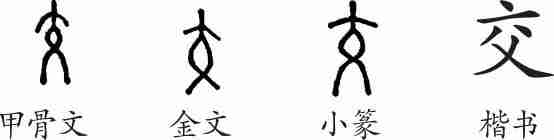 “交”是象形字。甲骨文像一个正面站立的人,两腿交叉着。金文和小篆的形体大致相同。隶变后楷书写作“交”。