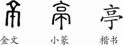“亭”是形声字。金文的字形像一座用以观察敌情的瞭望台。小篆从高,丁声。隶变后楷书写作“亭”。