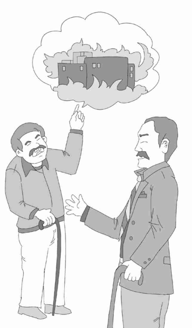 盲人越讲越激动:“您不知道当时情况是多么的紧急,火一下子冒了出来,人们像疯了一样朝门口拥挤而去。突然有一个大个子的年轻人在后面高喊‘让我先出去,我还年轻,还不想死!’于是他将我拥倒,从我的身子上面踩了过去。我昏迷了过去,等我醒来的时候,发现自己成了瞎子。”