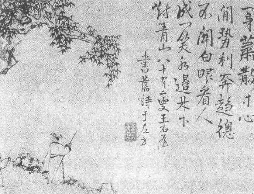 在画中,他巧妙地将人物安排在左下角,而右边一半的篇幅都让给了题诗,这种典型的文人画的构图方式在王树榖笔下运用得相当适宜。诗、书、画三者结合,透露出浓重的文人画书卷气息。而主人公持杖左顾的神态,让人联想到画中人的目光所及,定有惹人情思的景色。