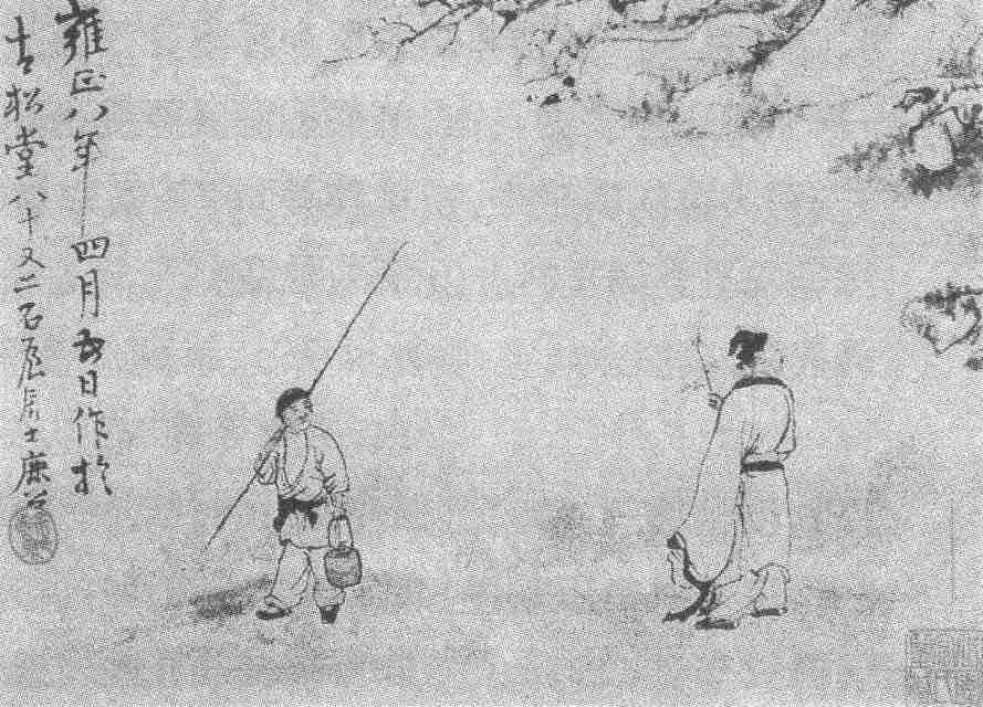 图三则是另外一副景象:主人闲来无事,欲垂钓湖上,却见岸上花枝招展,不禁折来一枝,却又留连花丛。王树榖把主人公那种欲行又止、徘徊再三的神态画得活灵活现,不由得让人会心于仆人那奇怪的面部表情了。