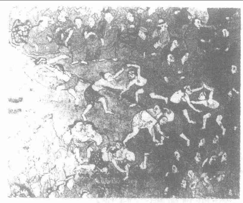 唐代以后,角抵从角抵大戏(百戏)中逐步分化出来.成为独立的体育项目。唐代角抵的独立发展,是唐代开拓进取的精神风貌的一个折射。唐代角抵,又称角力、相扑;司马光在《资治通鉴》中又称之为手搏。唐代有专门从事角抵的专业队伍,有专供表演的“相扑朋”组织。晚唐的角抵高手蒙万赢就是在唐懿宗咸通年间(860~873)选入相扑朋的,他在僖宗、昭宗二朝,累累供奉,受赐丰厚,是享有“万赢”称号的专业角抵名家。唐代的军队中也有角抵练兵,用来培养士兵的力量与勇气,许多士兵退伍后专门以角抵谋生。角抵在唐代仍作为宫廷宴飨时的助兴内容之一,在民间也广泛开展。据唐人张文规《吴兴杂录》记载:“七月中元节,俗好角力相扑。”浙中人李青洲,扬州人王愚子、谢建,江南人姚结耳等,都是十国时期江南地区的角抵名手(《角力记·考古》转引)。宋代人高承著有《事物纪原》上说:“角抵,今相扑也。”耐得翁《都城纪胜》说:“相扑、争交,谓之角抵之戏。”说明唐代的角抵到了宋代称为相扑。相扑在宋代是一种娱乐活动,受到统治阶级和人民的喜爱,它在朝廷宴会上可以表演;在城市瓦子中也可以表演。宋代的相扑与唐角抵相同,也是赤着上身扭摔,包括女子相扑也是赤着上身。《司马光文集·卷二十一·论上元令妇女相扑状》中说:“今月十八日,圣驾御宣德门,召诸色艺人,令各进技艺,赐与银绢,内有妇人相扑,亦被赏赍……今上有天子之尊,下有万民之众,后妃侍旁,令妇纵观,而使妇人裸戏于前,殆非所以隆礼法示四方也。”宋时相扑比赛不分重量等级,因此,身体高大就会大占便宜,当时有名的艺人在其艺名中就可看出其身体状况,如:撞倒山、宋金刚、倒提山、韩铜柱、武当山等等。当然只有体态庞大是不够用的,还要有许多方法和技巧,使用技巧取胜之人在其艺名中也可见端倪:周急快,王急快、董急快等等。所以当时相扑大致有体重型和敏捷型两种。当时比赛已有正式的规则,叫“社条”,其重要原则是双方公平比赛,不准施行不正当手段。在比赛中执行规则的裁判叫部署。部署在比赛前要向双方申明比赛规则。由于宋代社会喜爱相扑比赛,因此产生大批专业相扑艺人,一种是官方的,叫“内等子”,除了担任宴会表演外,还负责皇帝的警卫。民间的相扑艺人有自己的组织叫“角觝社”,多在瓦子勾栏中表演,艺人世代相传,以此为生。宋代有相扑专著问世,其中署名调露子的《角力记》是我国最早的一部摔跤史书。