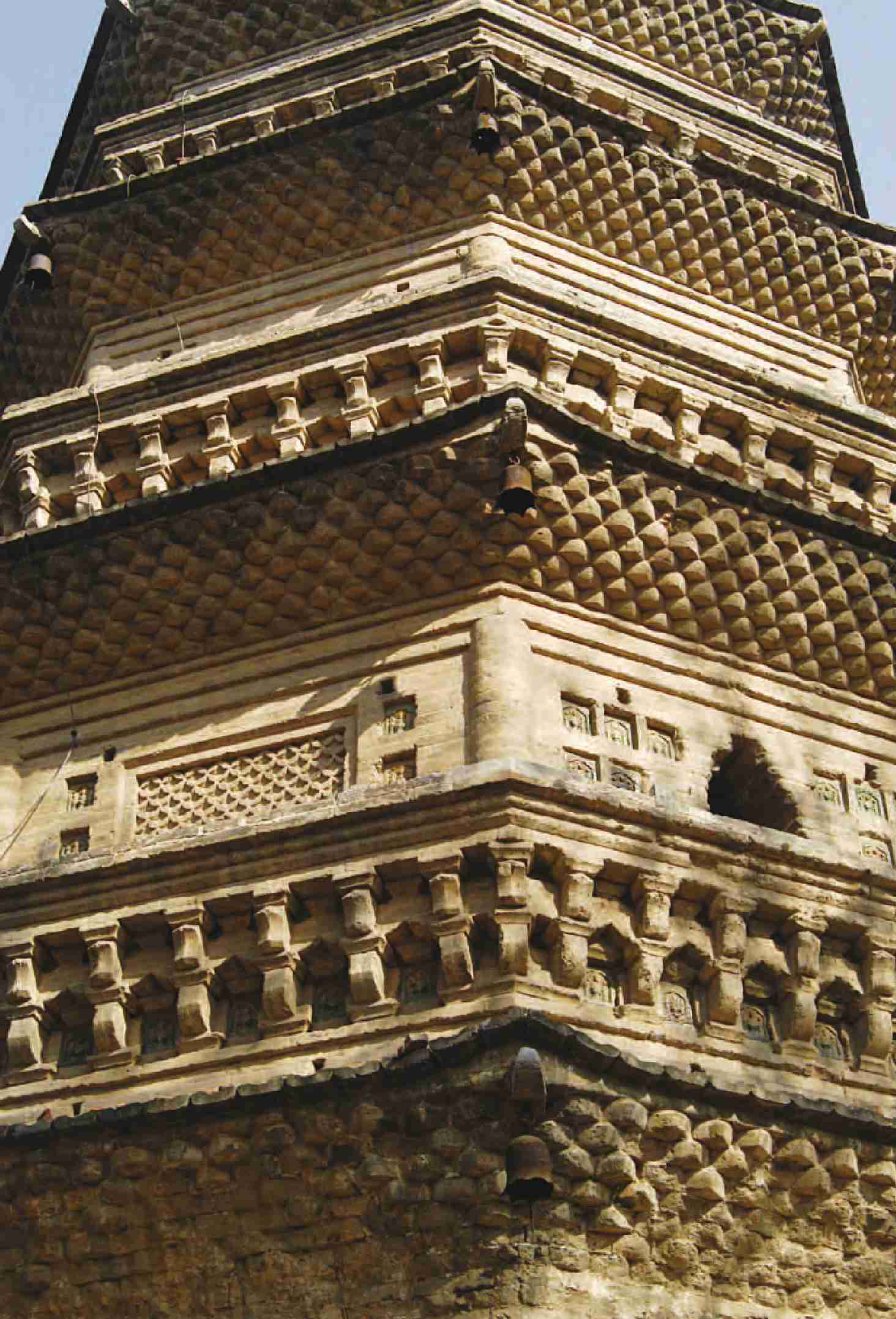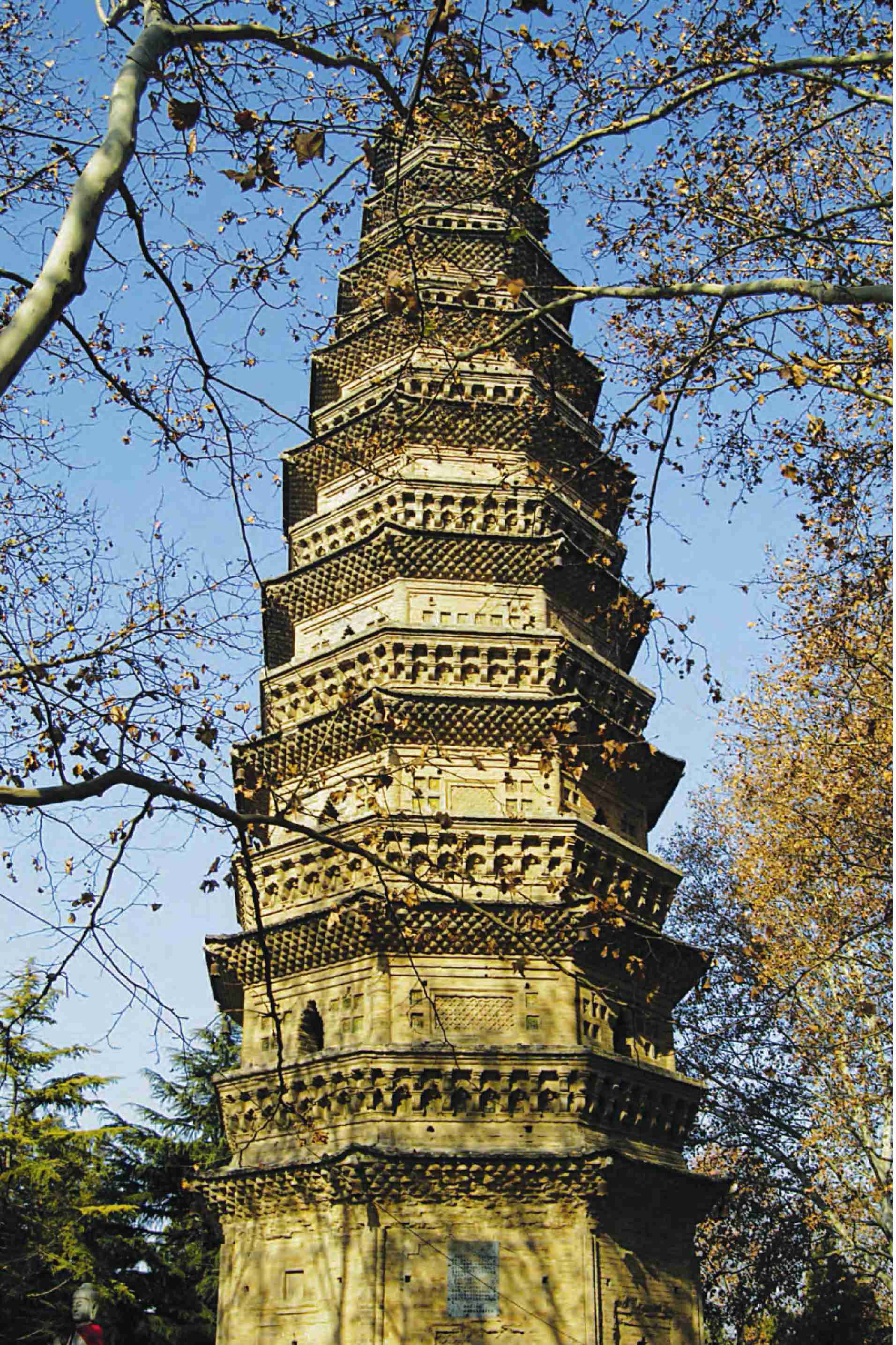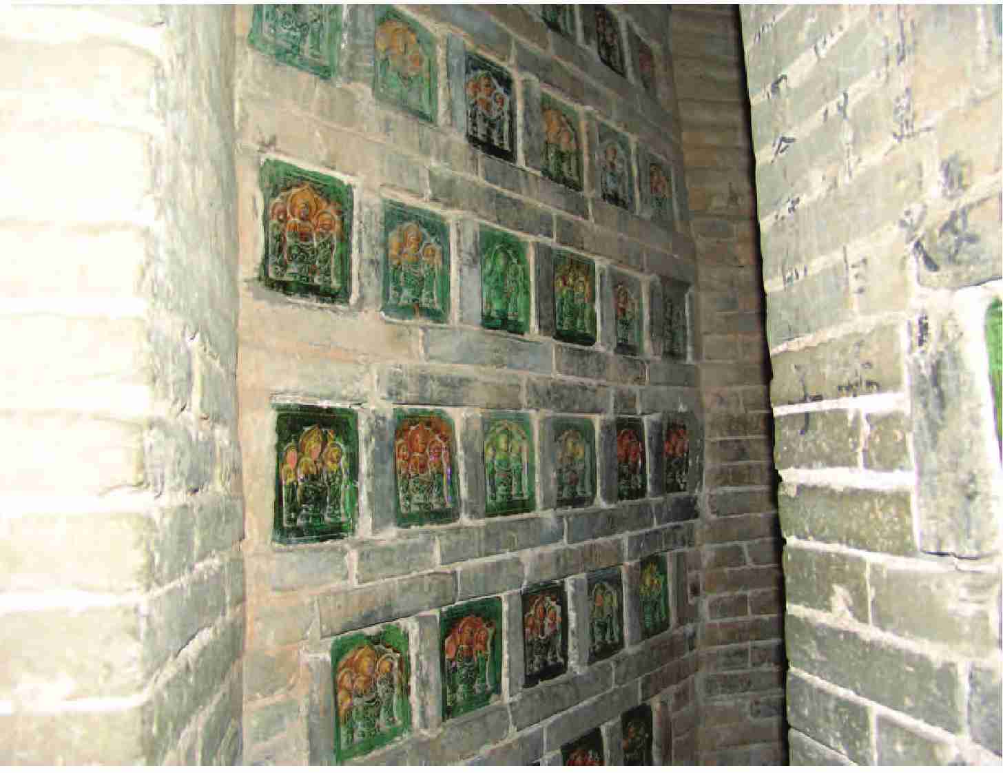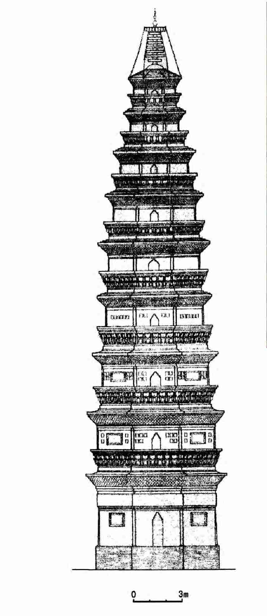 塔平面呈八角形,为仿木楼阁式砖塔,高九层,通高34.6m,塔底座边长3m。塔体自下而上每层逐渐收敛,每层高度也依次递减,整体轮廓略呈优美的抛物线形。该塔由基座、塔身和塔刹三部分组成,塔身每层正向四面(东、西、南、北)均辟圭形门,其余四面一至三层间施古钱纹、龟背纹、假窗。底层东、南、西各圭形门内为十层叠涩砖砌成的覆斗形顶方形小室,内建佛龛。北门为登塔门,由此门进入塔道,环绕而上可至塔顶。南门小室下为地宫,长方形,覆斗式顶,现仅存石匣,匣盖一侧刻有记述修建该塔情况的铭文。塔底层转角处为瓜楞形倚柱、砖砌莲花覆盆形柱础,二层以上均为半圆形倚柱。每层转角处施石质龙首角梁,悬挂风铎。塔体内外壁面上共镶嵌有相同的黄绿釉“一佛二弟子”佛像砖651块,塔内壁面还装饰有石刻塔铭四块、砖雕佛像一尊。