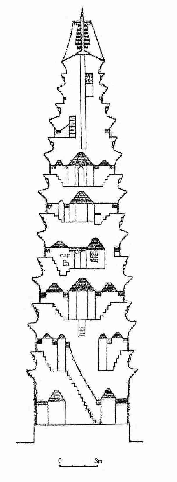 塔心室内部结构别具匠心:一层为穿心式;二层为穿心式与回廊式相结合,上施天花;三层为方形壁内折上式,十字通道,八角形塔室;四层方形壁内折上式,方形塔室;五层方形壁内折上式,四通道,八角形塔室;六层为方形壁内折上式,八角形塔室;七、八层同为八角形壁内折上式,无塔心室;第九层为实心砌体。塔的内部结构综合了多种古塔的建造手法,将穿心式、回廊式、方形壁内折上式及八角壁内折上式等糅合在一座塔内,在宋塔中实为少见,为宋塔结构中的精品。