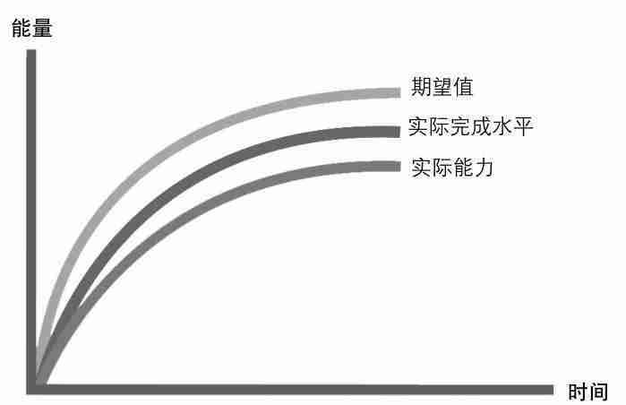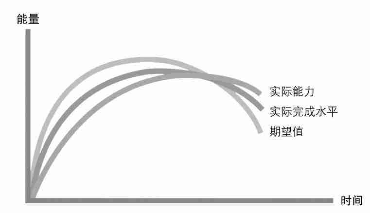 人们渴望获得认可。当你从事一项自己喜欢并且擅长的工作时,你最容易获得他人的认可。同时,这种认可带来的自我成就感会促使你更坚持不懈地努力。斯坦福大学的一项研究表明,人们会受到自我期望值强大的心理影响。它会影响你的实际完成结果,也会影响你的实际能力。通常,你对一项任务的完成期望值是高于自己的实际完成能力的。在高期望值的作用下,你会付出更多的时间和努力。因此,你的实际完成结果会介于你的期望值与自身实际能力之间,呈现逐步升高的趋势;你的实际能力也会像图6-1中的曲线所示,不断提高。