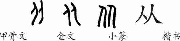“从”是会意字。甲骨文像两个面朝左站立的人,一个跟随一个,会前后相随之意。金文大体相同,小篆整齐化。隶变后楷书写作“从”。