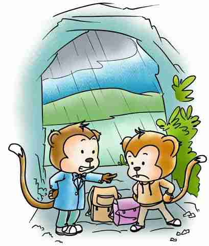 两只猴子决定下山玩几天,忽然下起了大雨,就在一棵大树下避雨。寒冷的天气使它们互相抱怨起来: