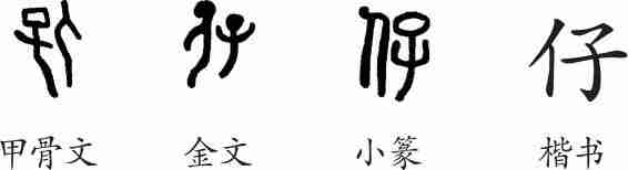 “仔”是会意字。甲骨文从人,从子,会人背小孩之意。金文调换了大人与小孩的位置。小篆承接金文而来。隶变后楷书写作“仔”。