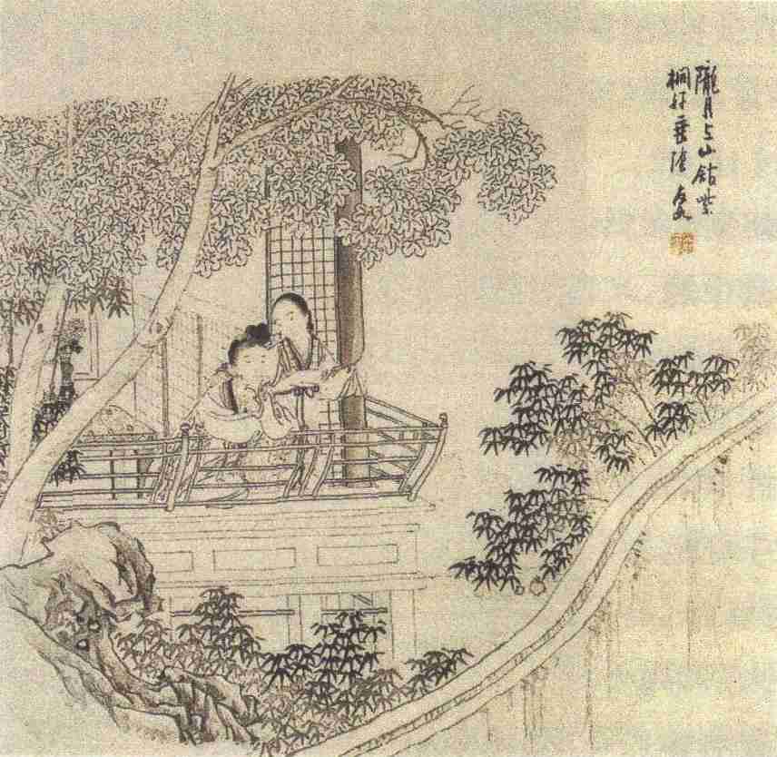 吴友如的《仕女图》册,体现了画家的典型画风,兹选其中的一幅。画中表现的是庭院一角,在山墙四周数竿修竹和一株梧桐的掩映下,两个女子凭栏而望,一人托腮而睇,若有所思,另一人回首看着她,似乎正在劝解宽慰。