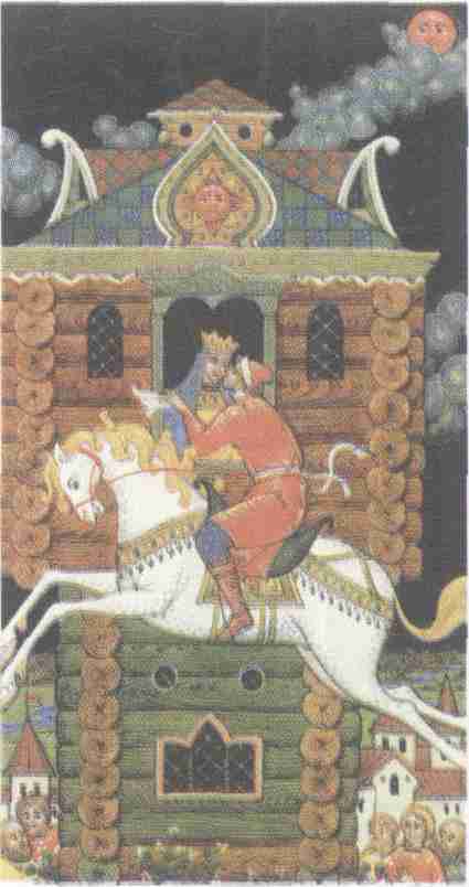 俄罗斯童话插图:农家的孩子伊万,骑上马跳得那么高,跟阁楼里的公主亲吻,国王答应让他和公主结婚,并且得到一半国土。