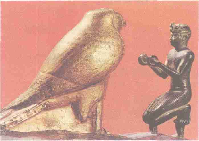 献给神鹰荷美两杯神酒的国王塔哈卡 (片岩·木材·青铜·台座镀银鹰身涂金) 公元前689-680年