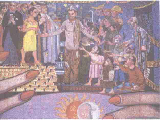墨西哥壁画巨匠里维拉于1958年为墨西哥城的英色珍蒂斯绘制的壁画,画中的意思为: 经济平等论者正从富者手中拿过钱来施予贫者。
