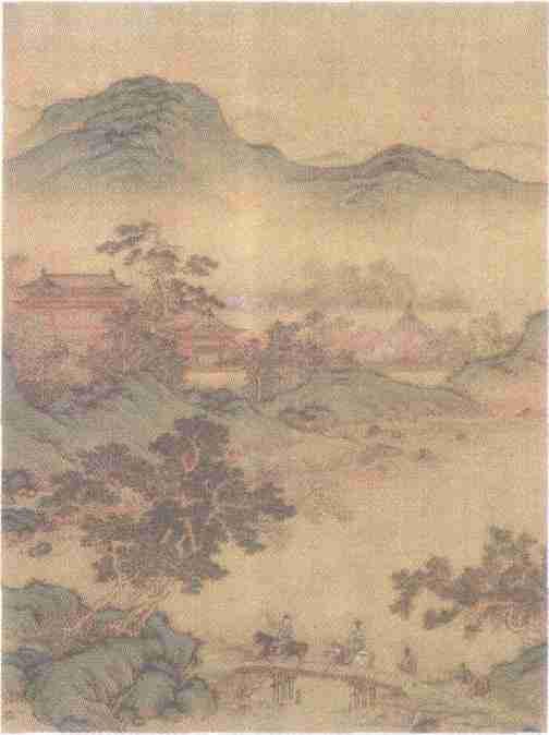 士人策骑,相伴游春,青山绿水,桃红李白,一片春光明媚。选自《明人画壑清晖册》