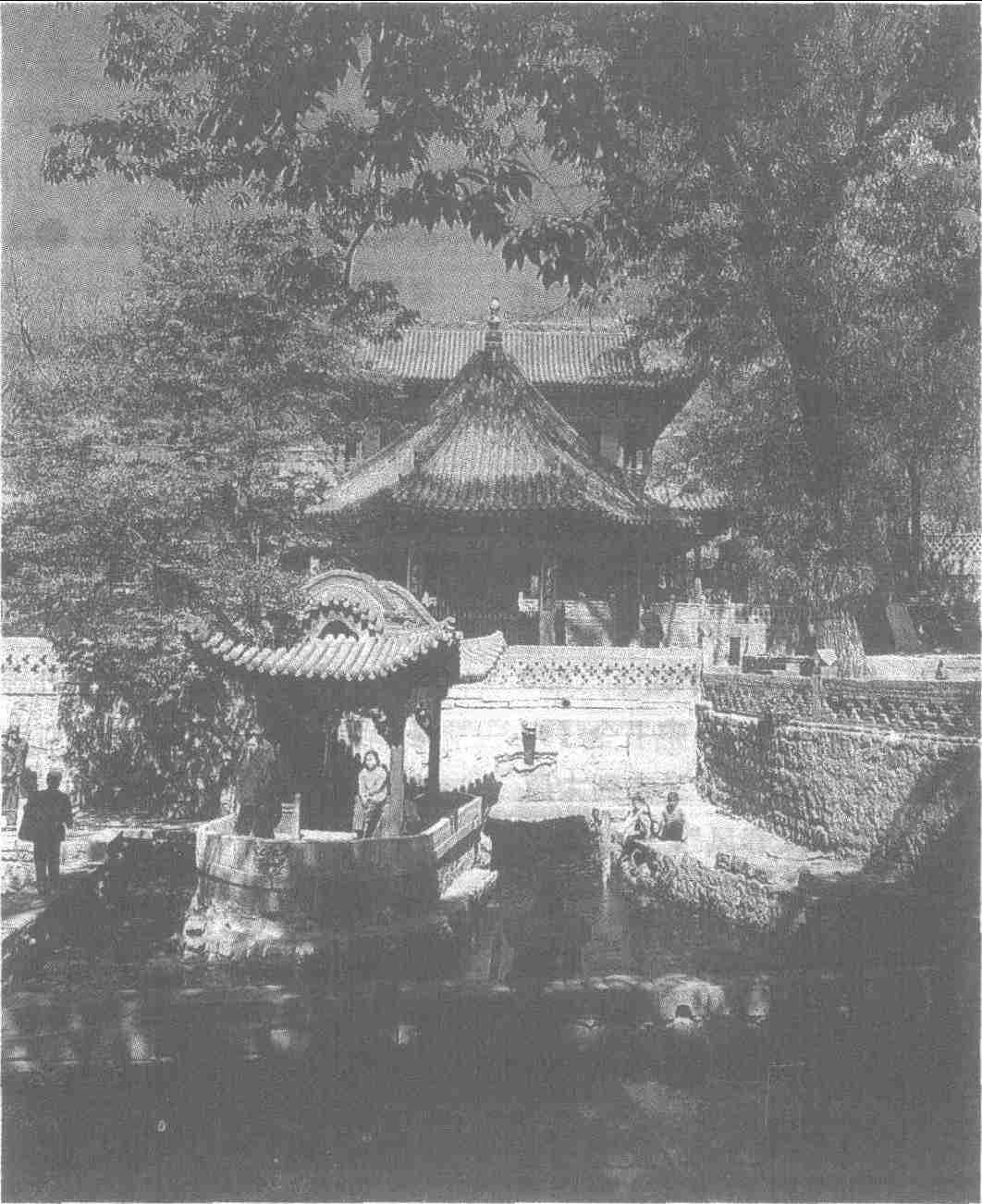 晋祠,在山西太原市西南悬瓮山下,晋水发源处。始建于周朝,为纪念周武王次子姬虞而建,距今已有2000多年历史。周成王时,封其弟姬虞于唐 (今太原附近),虞之子燮建都于晋水旁,改国号为晋,故后人称晋祠。北魏郦道元 《水经注》记载: “际山枕水,有唐叔虞祠。”唐叔虞祠 (姬虞为皇叔,故又称叔虞),即今晋祠。祠内有规模宏大的圣母殿,殿内有43尊宋代彩塑。祠内著名的周柏、隋槐,至今生机勃勃、郁郁苍苍,这些古树与长流不息的难老泉,以及精美的宋塑侍女,被称为 “晋祠三绝”。周柏在圣母殿左侧,隋槐在关帝庙内。宋塑侍女为主像圣母的侍从,或侍饮食起居,或梳洗清扫,各有所奉,神情各异,姿态自然,为宋代宫廷生活的写照。难老泉是晋水的主要源头,水温17℃,常年不息,由十孔分水,南北两渠,流入山野,灌溉稻田4万亩,水势清澈晶莹,常生萍四季一色。