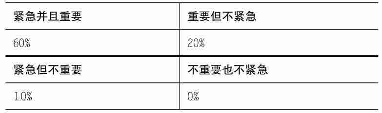 如表9-2所示,恭喜你,80%的时间花在了重要的事情上,其中60%花在了紧急且重要的事情上;另外20%的时间花在了重要但不紧急的事情上。这已经非常好了。至少你没有花太多时间在不重要的事情上。我们很多员工都觉得自己每天上班忙得昏天黑地,像救火员一样,不停处理各种“火灾”现场:系统崩溃,突然到来的客户投诉,经理布置了紧急的报告要一晚上赶出来,等等。