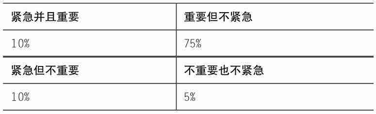 如果你经常使用这张时间分配表,并且及时分享给你的经理,你的状态一定会越来越好,甚至达到一个高价值员工的理想时间分配状态,如表9-3所示。你75%的精力都花在了重要但不紧急的事情上,这说明你的工作安排得井井有条,你持续聚焦在关键要务上,没有失去焦点。同时,也说明你和你的团队的“错误产出”正在减少,虽然偶然出状况,但10%的情况是完全正常的,生活里不可能不出现意外事件。小的意外事件是提升我们复原力的最佳机会。
