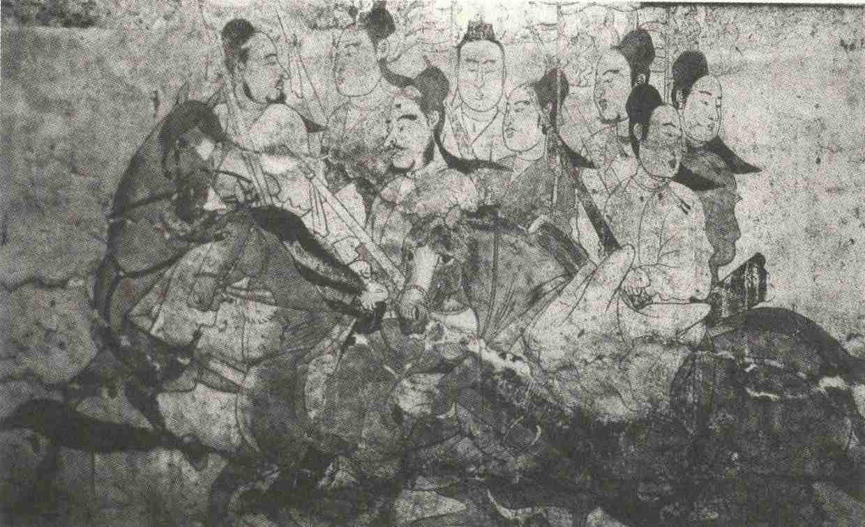 《出行图》和《归来图》的下层,东西两壁,都画诞马、吹角的侍卫,其中一组四人,两两相对,仰举长筒状朱漆木角,奋力鼓吹,仪容壮严,这两壁一送一迎,各与其上部的《出行》、《归来》紧密配合。从而把整个墓道壁画构成一个场面开阔、声势浩大、气象宏伟的图卷,展现了北齐皇室外戚的生活图象,以及漠北原野的浑朴气氛。