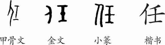 “任”是会意兼形声字。甲骨文从人,从壬(承受),会人抱在怀里之意,壬兼表声。隶变后楷书写作“任”。