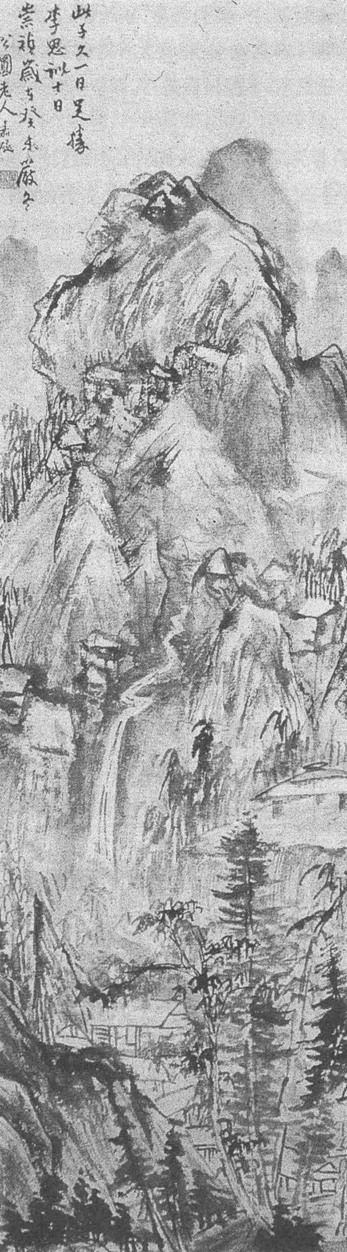 再次,程嘉燧在这幅写意性很强的山水画中,仍然把一些细节描绘得合情合理。这里包括村舍、茅亭以及瀑布等,显示出文人画家在强调直抒胸臆的同时,还是十分在意绘画本身的特点,从而使这种胸臆的抒发有一个合乎绘画规范的依托。
